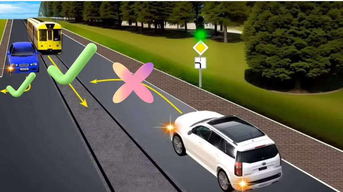 Таким образом, водитель белого автомобиля обязан уступить дорогу трамваю. А что насчет синего автомобиля? Пункт 16.6 ПДД уточняет: «Поворачивая налево или разворачиваясь при зеленом сигнале основного светофора, водитель нерельсового транспортного средства обязан дать дорогу трамваю попутного направления, а также транспортным средствам, которые двигаются во встречном направлении прямо или поворачивают направо».