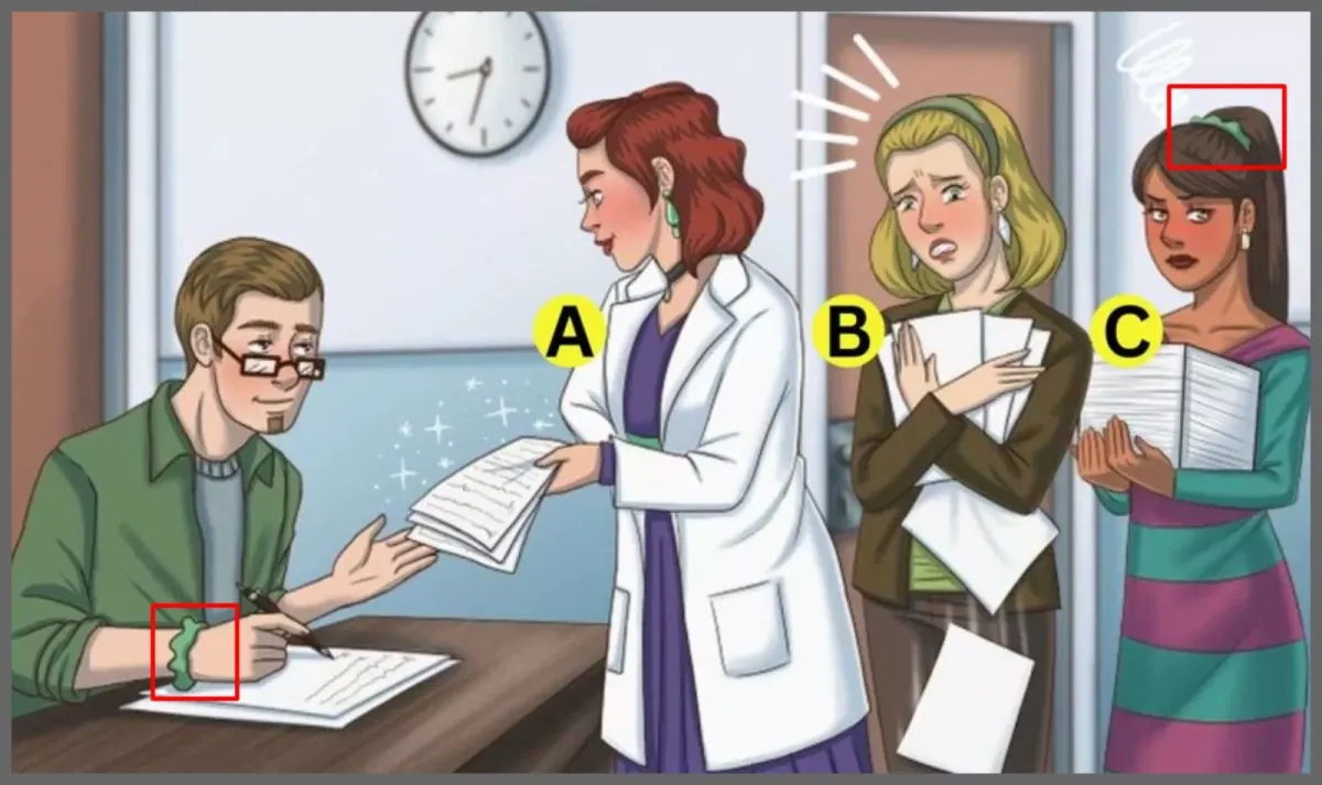 На первый взгляд может показаться, что первой женщиной является жена, так как она обменивается с мужчиной уверенными взглядами, в отличие от второй. Однако только самые внимательные заметят важную деталь: на руке мужчины есть резинка для волос, которая могла принадлежать его супруге. Аналогичная деталь присутствует и у третьей женщины.