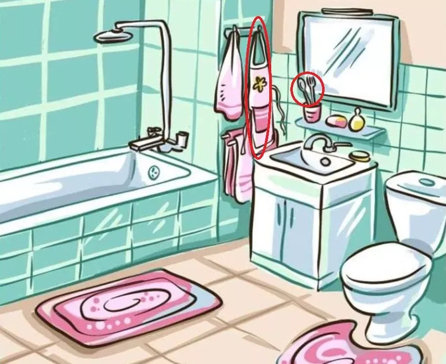 Как видно, в ванную попали предметы из кухни: вместо зубных щеток в стаканчике находятся вилка и ложка, а вместо полотенца висит передник.