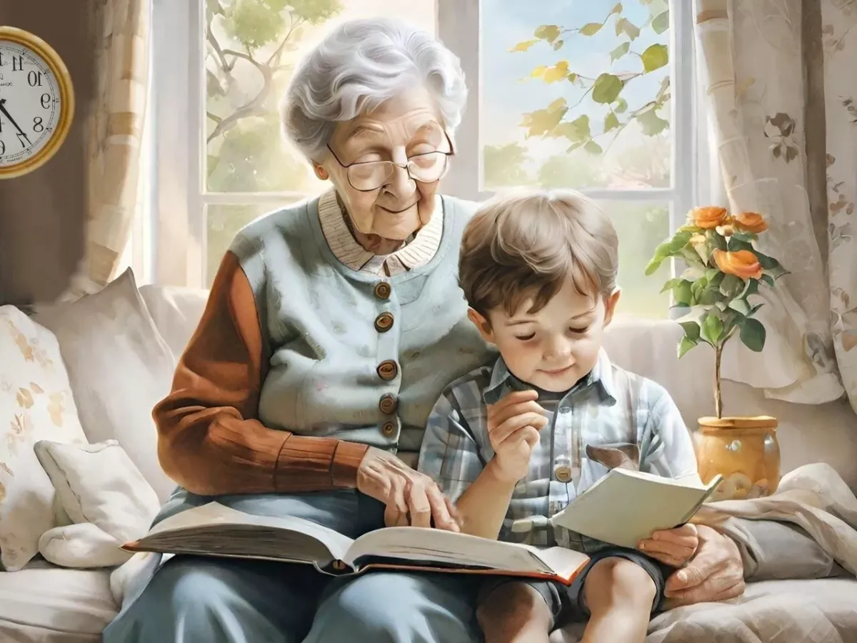 Предлагаем вам разгадать картинку-загадку, на которой изображены бабушка и её внук. Пожилая женщина читает мальчику книгу.