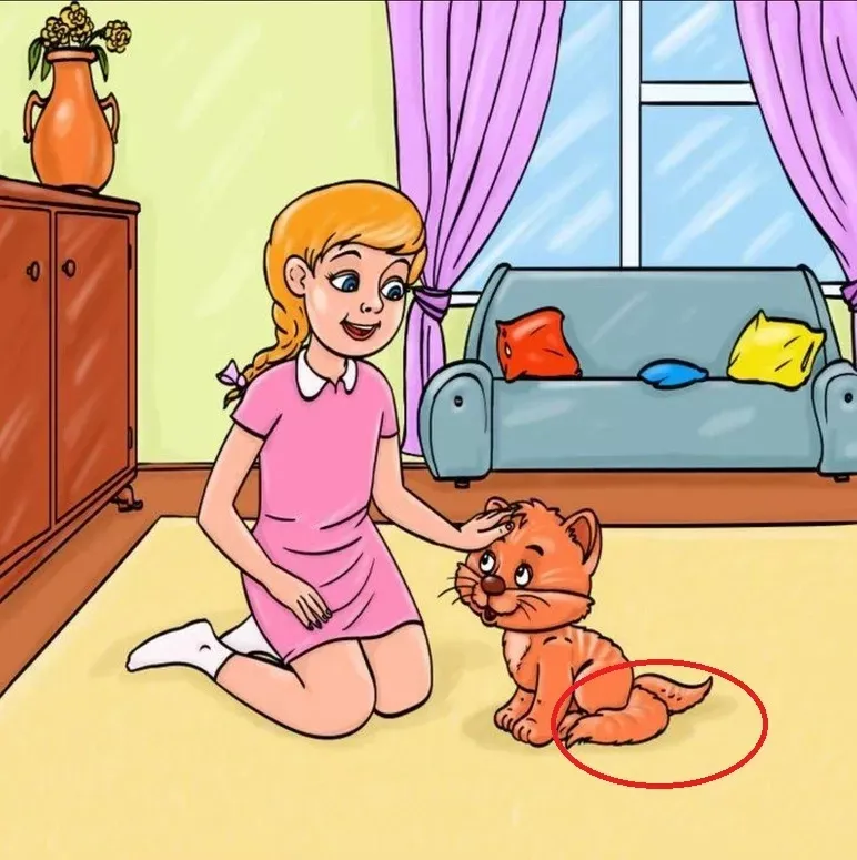 Ошибка заключается в странном хвосте кота: как видно, у него целых два хвоста, что совершенно нелогично, согласны?
