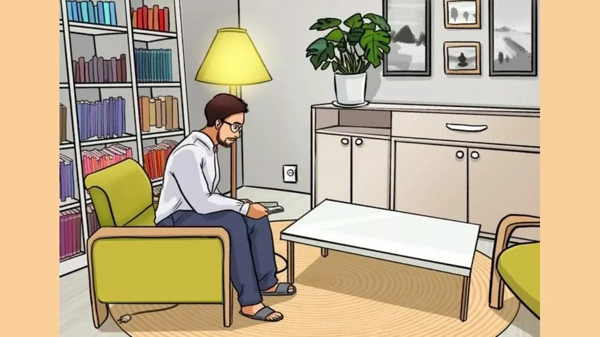 Как видно, вилка от лампы не подключена к розетке и лежит под креслом, в то время как лампа продолжает светиться, что, конечно, невозможно.