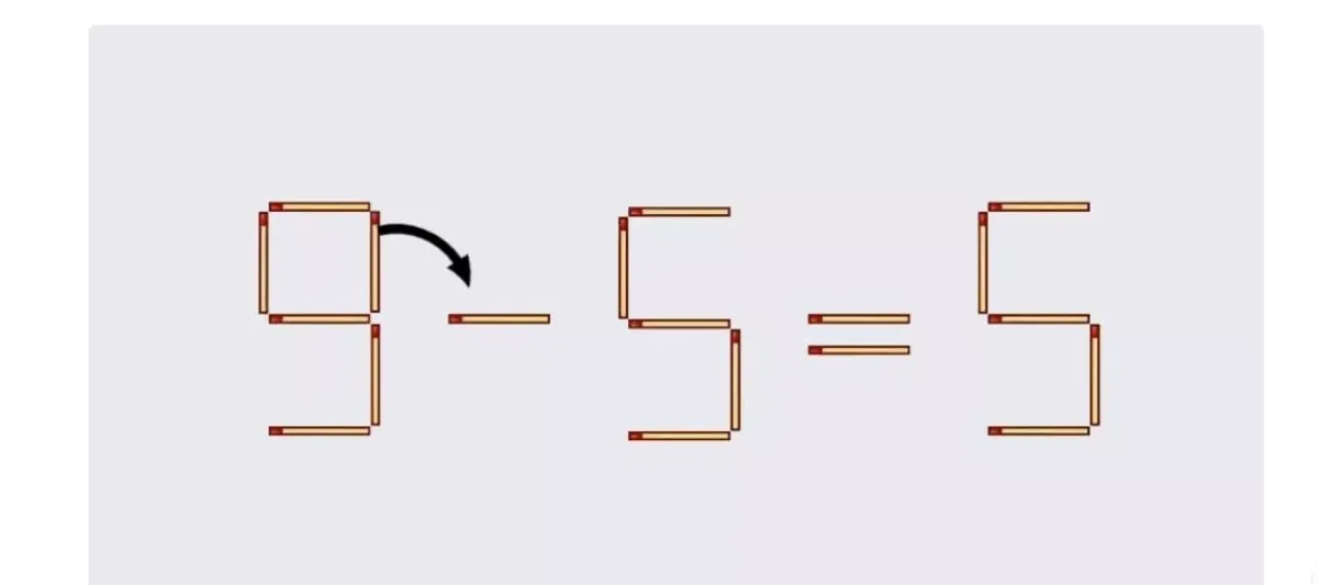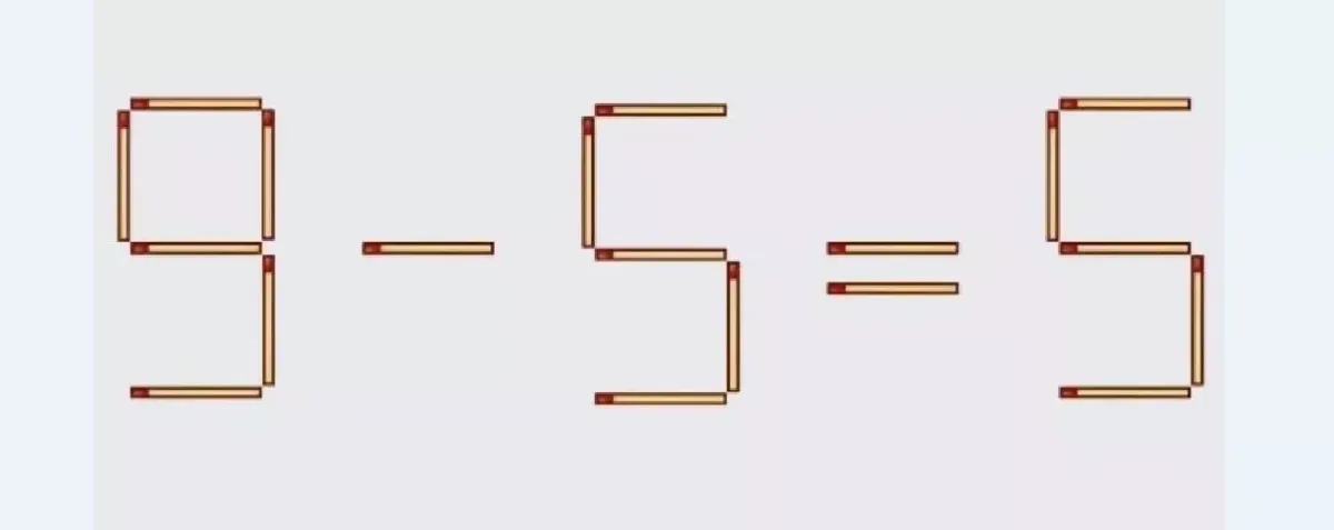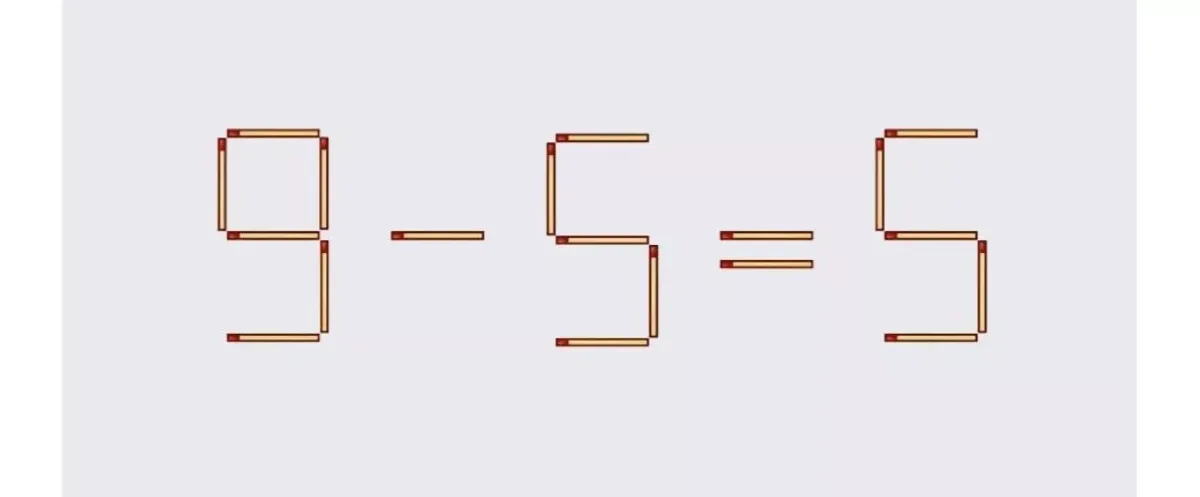 Предлагаем вам интересную задачу с использованием спичек. Вам нужно всего лишь переместить одну спичку в уравнении 9−5=5. В данный момент это уравнение неверно, так как художник ловко замаскировал правильный ответ.