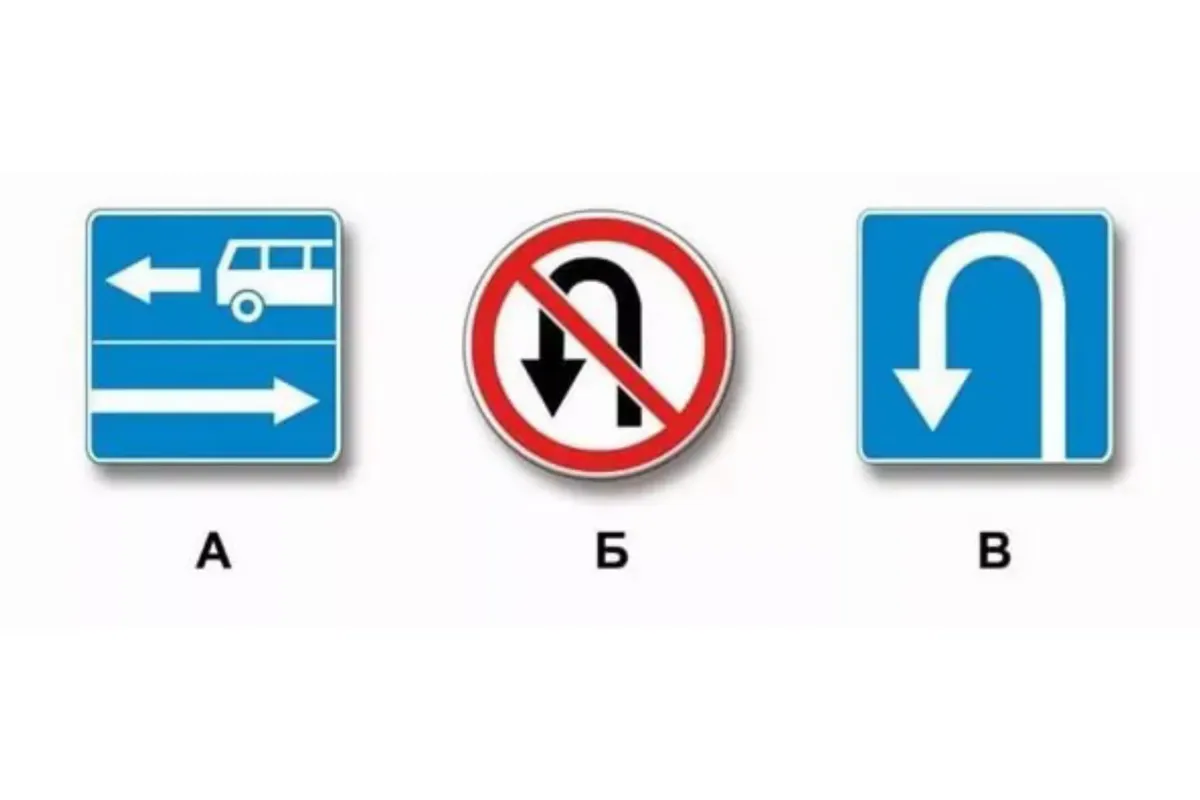 Вопрос: Какой знак запрещает поворот налево? а) только А; б) только А и Б; в) только А и В; г) все запрещают; д) я разрешу себе повернуть налево под любым из них.
