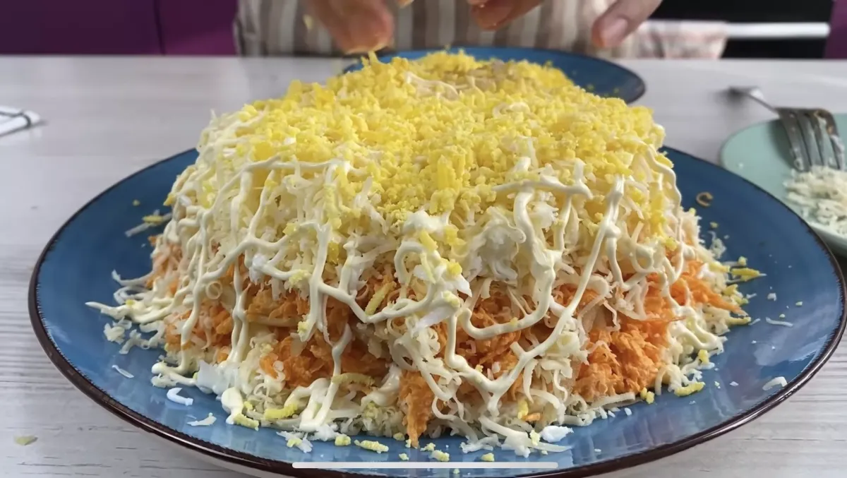 Соберите салат слоями в следующем порядке: 1 слой — лук; 2 слой — морковь; 3 слой — яблоки; 4 слой — яйца; 5 слой — сыр.