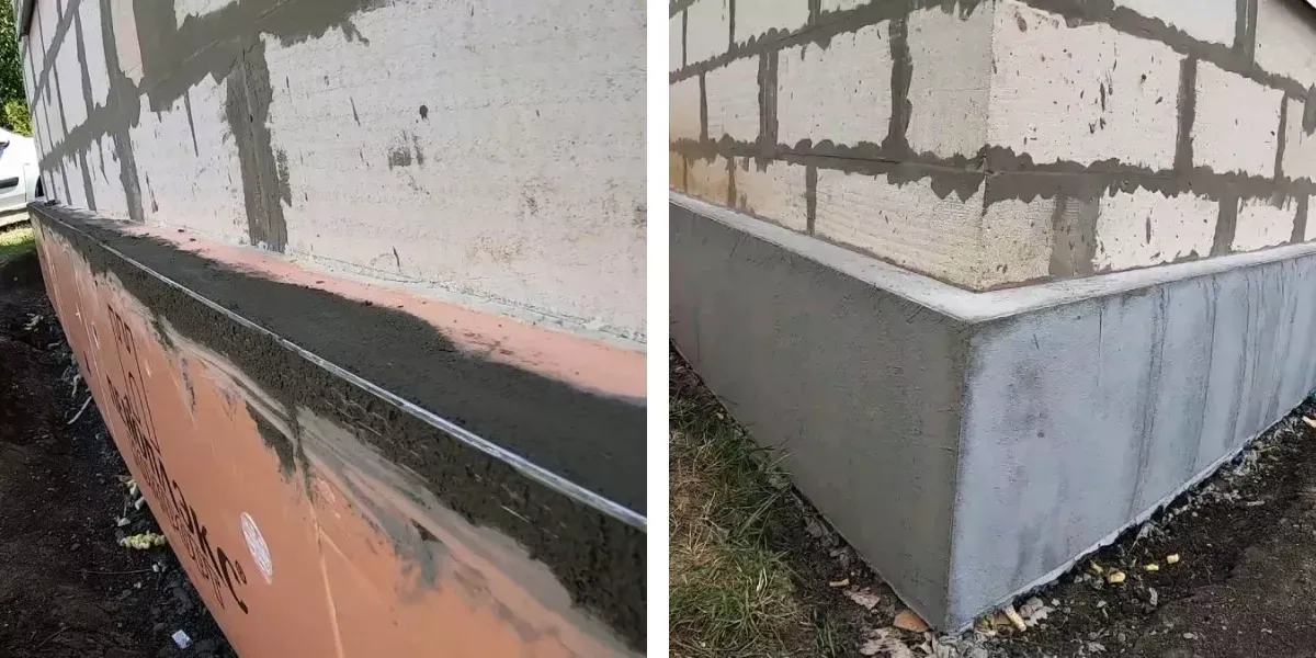 Затем наносим штукатурку на приклеенный пеноплэкс и снимаем её гребенчатым шпателем с зубцами 6 мм. Пока раствор не успел высохнуть, вклеиваем стеклопластиковую сетку и выполняем штукатурку, чтобы создать тонкий защитный слой для утеплителя.