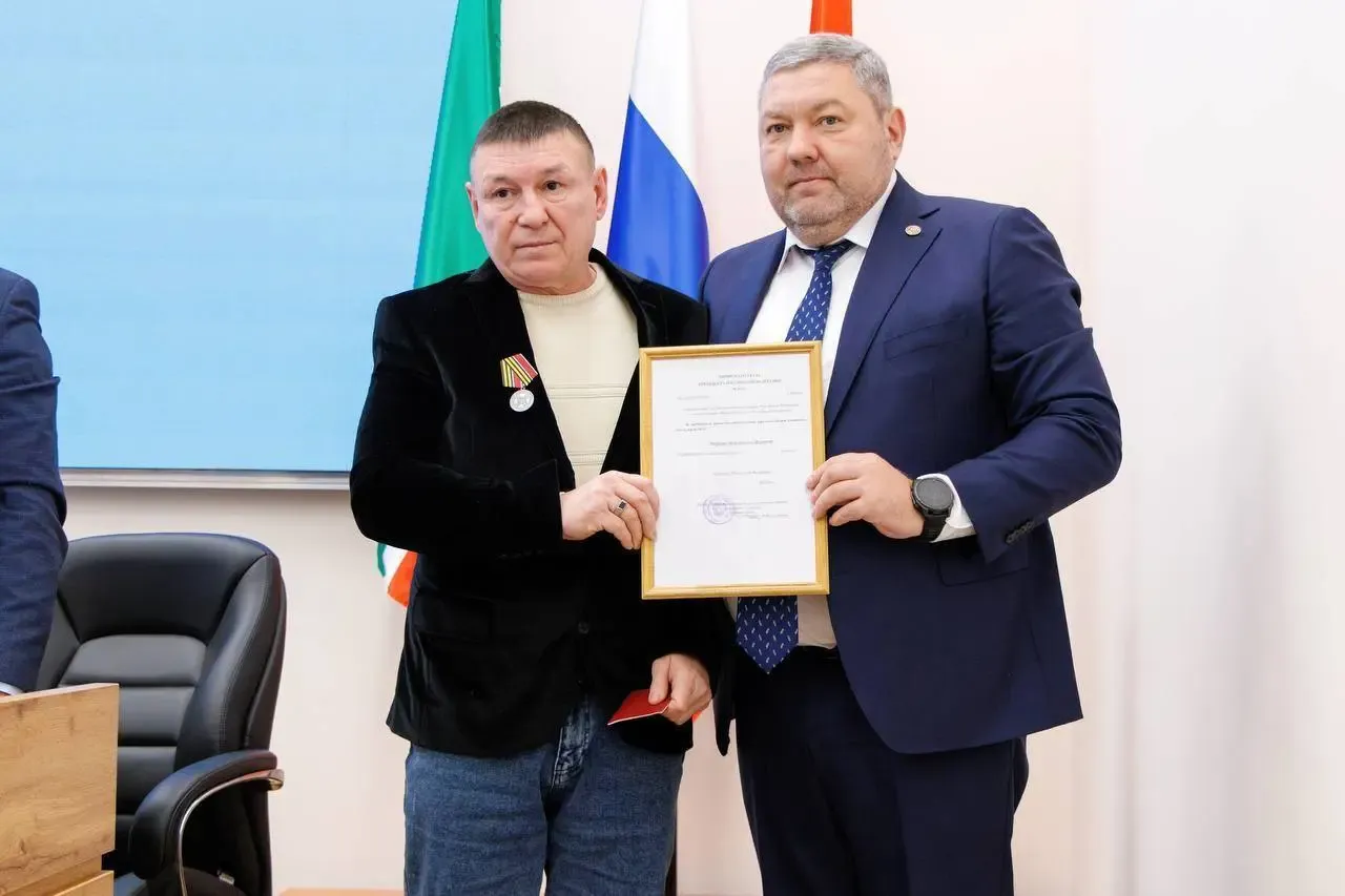 В Верхнеуслонском районе прошла церемония вручения медали «За храбрость» II степени Тагиру Гильфанову, участнику специальной военной операции. Награду передал глава муниципалитета Евгений Варакин.