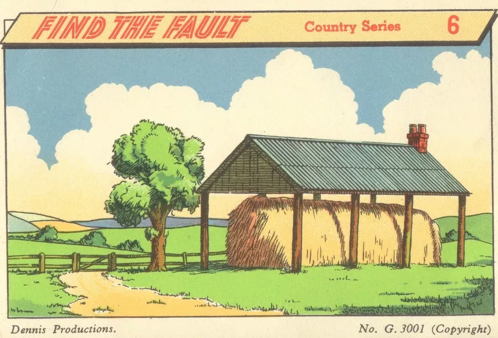 Первая ошибка заключается в том, что на крыше сеновала есть труба от несуществующей печки. Вторая ошибка - дорожка заканчивается у калитки, но не продолжается за ней. Третья ошибка - забор доходит до сеновала, а за ним его нет.