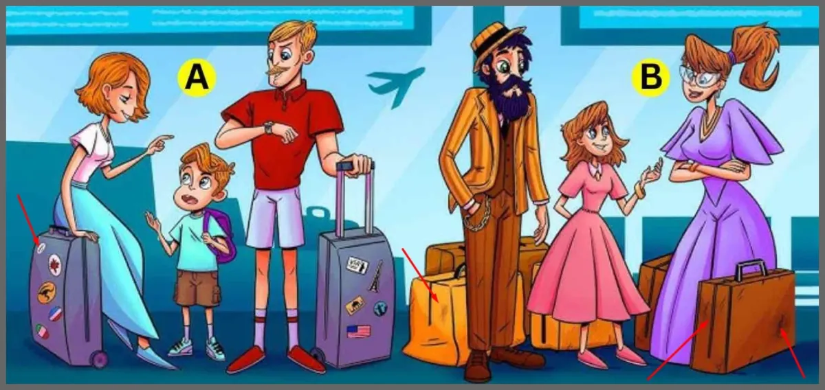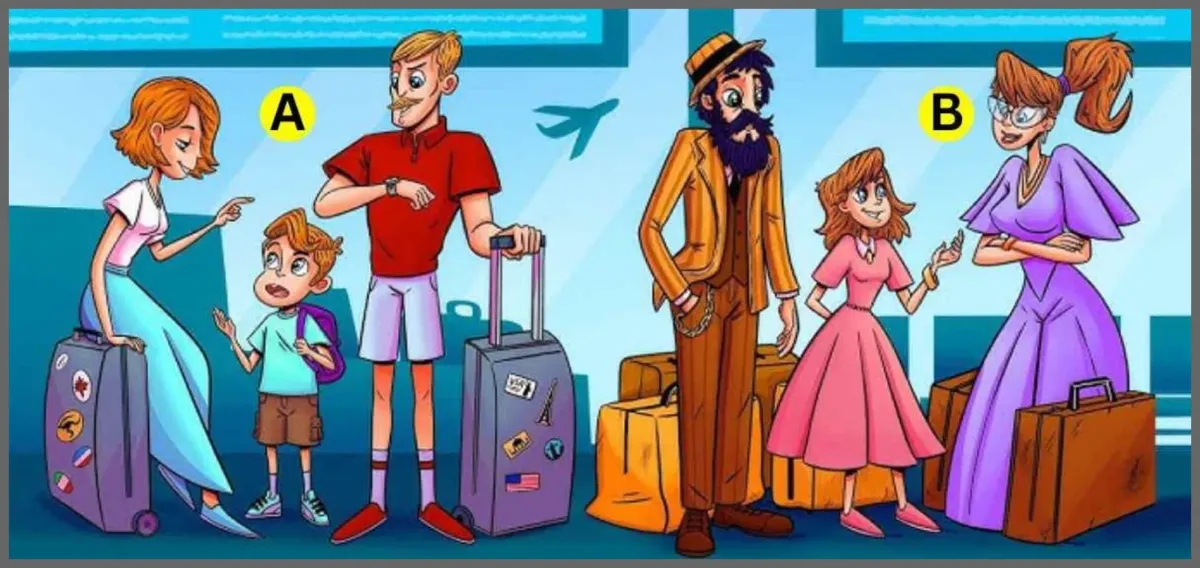 На представленной картинке изображены две семьи, которые собираются в путешествие и находятся в аэропорту. Ваша задача — определить, какая из семей является менее обеспеченной.